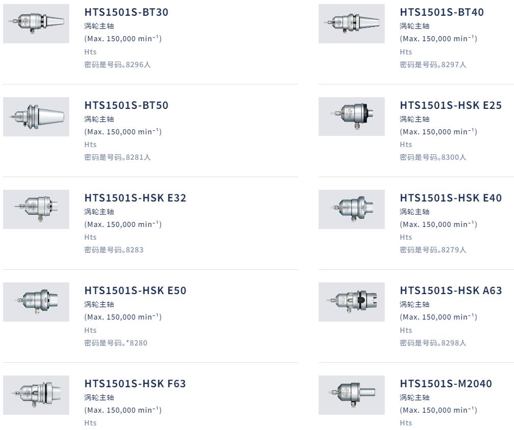 这款气动增速刀柄属于中西NAKANISHI主轴HTS系列,有多种刀柄可以提供,如下图所示,欢迎有需求的客户来电咨询。功率25W,旋转跳动精度1μm以内,真正实现高速高精密加工。