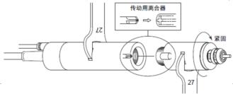 将马达前部的螺丝对准主轴后部的螺丝朝顺时针方向转动。如果旋转传动用离合器未啮合时,与马达连接的螺丝旋转2圈就不能转动,这时,不可用力紧固,将螺丝稍微旋出后用手指转动,使离合器啮合后再拧螺丝,最后用附带的27mm扳手紧固。 |