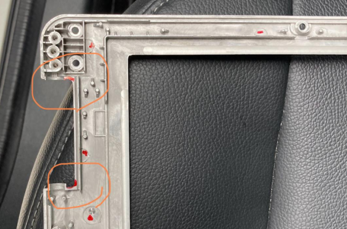 这些标红色点点的部位就是需要去除毛刺的地方。用一般的打磨工具如橡胶磨头、抛光轮等是不容易去除的。所以需要借助气动锉刀这个工具,来进行前后往复打磨才可以。