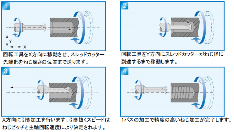 将线程切割器安装到NSK高频铣上,高速旋转。将被加工件低速旋转。主轴的旋转方向由螺丝类型(左旋或右旋)决定。