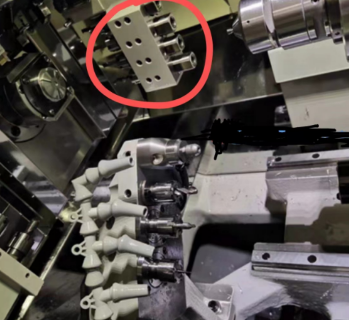 图中画圈部分为野村走心机主轴位置,想要这个位置加装高频铣,刀座孔为22mm,因此配直型高频铣BM-322就刚合适。不仅可以用来端面钻微孔、铣槽、倒角去毛刺等加工。