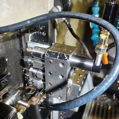 如图所示,是气动动力头MSS-2008RA加装在走心机挂架上的现场案例,客户用来给黄铜钻孔使用。出力大,可以钻2-3mm的孔。除了走心机之外,刀塔机、排刀机等数控车都是可以加装的。