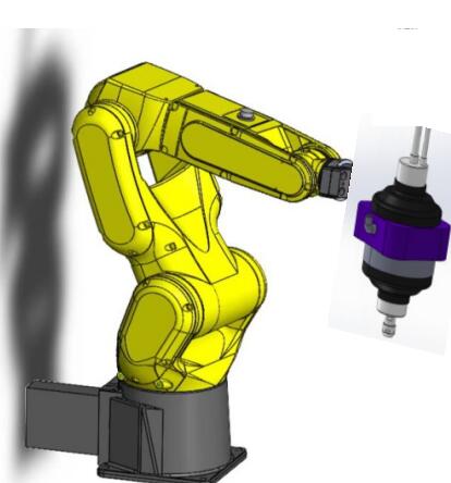 MSIY-20浮动主轴一般加装在机械臂末端上使用,因为体积小,重量轻,因此只需要一个小型工业机器人就能加装。