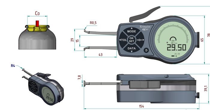 德国kroeplin数显内卡规AEL2100,测量带1英寸(25.4毫米)搭扣封口的气雾剂容器上的搭扣宽度。测量范围:25-29mm,精度:0.01mm,深圳春亨工具代理商。