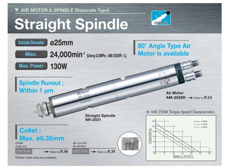高速主轴NR-2551搭配气动马达AM-2526R/L,可作为气动主轴使用,性价比高,又常被称为高速气动钻,进行钻孔等加工。