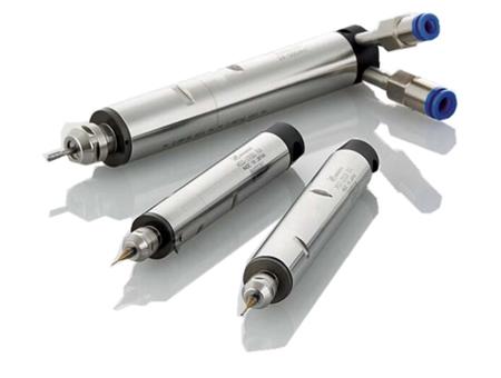 主轴跳动精度2um以内。 外径材质为高硬度热处理,形状有直线型和90°2种。(R-直线型,RA-90°型) 消音装置采用排气式消音器,1m的距离我们测试结果为70db。 减速方法是采用1/4,1/16的行星减速齿轮。