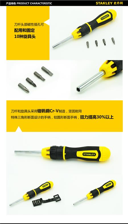 刀柄头部磁性插孔可配用和固定10种旋具头,并采用铬钒钢Cr-V制造,坚固耐用!